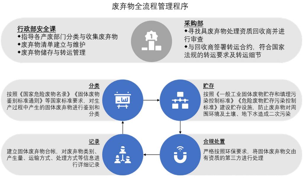 本集團嚴格遵守《中華人民共和國環境保護法》《中華人民共和國固體廢物污染環境防治法》等法律法規,制定《廢棄物管理程序》,明確“分類回收、集中保管、統一處理”的廢棄物管理原則,對固體廢棄物進行分類、貯存、合規處置及記錄的全流程管控,以盡可能降低廢棄物對周圍環境的影響。
